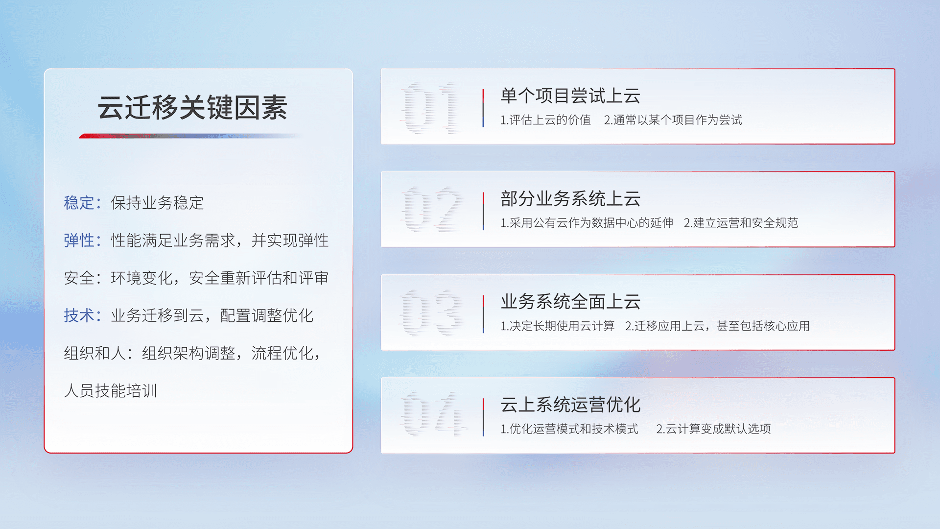 结合实际业务,,从规划设计、、、、云平台选型、、、、云原生改造、、、数据迁移、、、集成交付,,迁移全过程为客户识别最佳上云路径,,,,做好风险识别管理,,,,设计网络架构、、、、身份权限、、安全审计合规、、、操作审计、、、日志审计、、监控告警策略、、、、多站点容灾设计等,,对云上基础设施进行整体规划,,,,提升IT治理水平,,,以满足弹性、、、高可用、、高性能的需求。。。