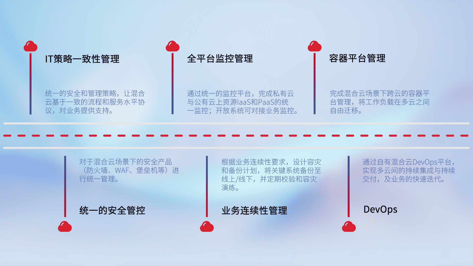 通过多云纳管,,以统一的资源数据模型把客户的云资源进行抽象和封装,,,,进而实现对多云资源的统一操作,,,保障云资源管理的可靠性、、、、稳定性与可用性。。量身定制化运维内容,,,配置、、、、开发运维、、、补丁管理、、、、备份、、、、监控、、认证和访问管理、、、、审计和日常巡检等,,保障在用云过程中的可靠度,,,稳定度以及高可用率。。